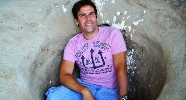 עדיין בעיר המערות, מעשה ידי בני אדם לפני אלפי שנים. בתמונה: אבי אלגרבלי, סמנכ"ל התפעול של אנקור, נצפה מתמקם לרגע באחד מבורות המים. נעים וקריר