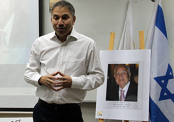 פרופ' עמרי ידלין, נשיא המכללה האקדמית ספיר, ולידו תמונתו של יוסף בן לולו ז"ל, שעל שמו נקרא המרכז ליזמות וחדשנות במכללה