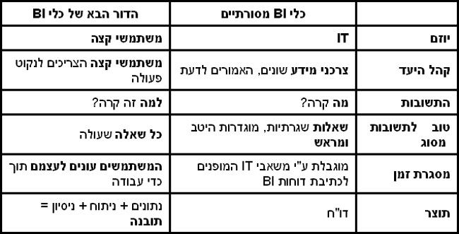 הטבלה שלהלן מדגישה את ההבדלים בין כלי BI המסורתיים לבין הדור הבא של כלי BI: