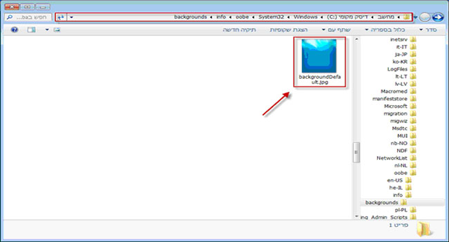 6. לתיקייה זו תוכלו להעתיק כל קובץ אותו תרצו להציג כרקע מסך הכניסה, להוציא ההגבלות הבאות: הקובץ חייב להיות בעל סיומת JPG, הוא לא יכול להיות גדול מ-255 קילו בייט, ושם הקובץ חייב להיות backgroundDefault.jpg. כמו כן, מומלץ לוודא, כי גודל רזולוציית הקובץ זהה לרזולוציית המסך, על מנת להציג את התמונה באופן תקין.