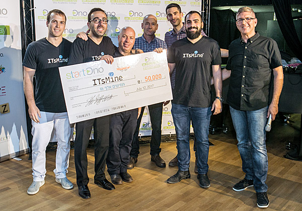 מימין: יאיר סאקוב, יו"ר מרכז היזמות בקריה האקדמית אונו; גיא בן מאיור, ממקימי ITsMine; צביקה גליקמן, מנהל מרכז היזמות; פרופ' אריה גביוס, דיקן הפקולטה למנהל עסקים בקריה; ד"ר גיל אבנימלך, דירקטור מרכז היזמות; כפיר קמחי, מנכ"ל וממייסדי ITsMine; ורן נורמן, ממייסדי החברה. צילום: גיא טואג