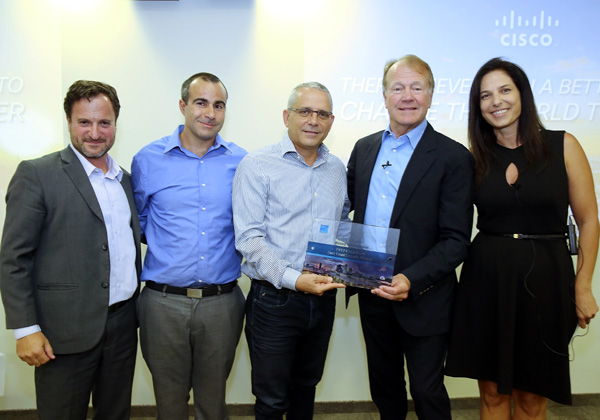 מימין: שרית רצר, מנהלת השותפים של סיסקו ישראל; ג'ון ציימברס, יו"ר סיסקו; מוטי אלמליח, מנכ"ל בזק בינלאומי; אייל צפריר, סמנכ"ל החטיבה העסקית בבזק בינלאומי; ואורן שגיא, מנכ"ל סיסקו ישראל. צלם: ניב קנטור