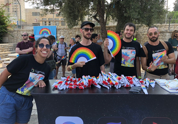אנשי לייטריקס בפעולה במצעד הגאווה בירושלים. מימין: אוריה בס, מעצב; נדב כהן, צוות תפעול; ערן טל, מעצב; ואריאל פז, מעצבת. צילום: יח"צ