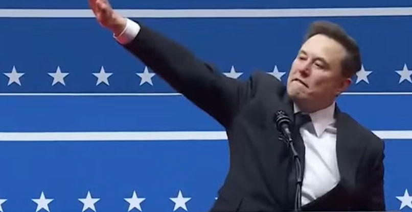 בחגיגה שנערכה לאחר ההשבעה של השותף שלו, דונלד טראמפ, לנשיאות ארצות הברית, הרים מאסק את ידו באלכסון, פעמיים, במה שהזכיר לרבים את התנועה הנאצית. הוא עשה זאת תוך כדי שאמר על ניצחונו של טראמפ בבחירות: "זה לא היה ניצחון רגיל. זאת הייתה אבן דרך בציוויליזציה האנושית. יש ניצחונות (בבחירות בארצות הברית – י"ה) שלא היו חשובים ויש כאלה שכן. זה היה ניצחון ממש חשוב".