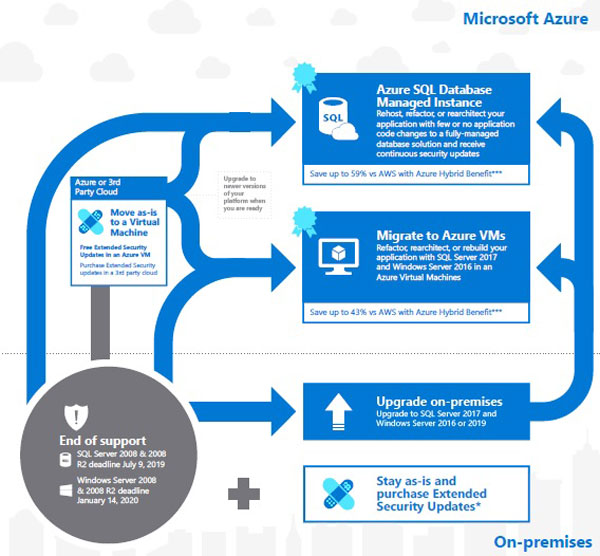 ניתן גם להעביר את מסדי הנתונים מבוססי ה-SQL Server 2008 וה-2008 R2 ללא שינוי בקוד היישום וללא זמן השבתה ל-Azure SQL Database Managed Instance. זהו מסד נתונים מנוהל באופן מלא כשירות עם SLAs מובילים בתעשייה, וככזה – אינו דורש שדרוגים עתידיים. חשוב לציין כי ניתן להשתמש ברישיונות קיימים בעת העברת סביבות SQL Server ו-Windows Server ל-Azure Virtual Machines או ל-Azure SQL Database Managed Instance. הטבה זו מאפשרת ללקוחות שיש להם Software Assurance לחסוך עד 55% על עלות הפעלת SQL Server ו-Windows Server ב-Azure.