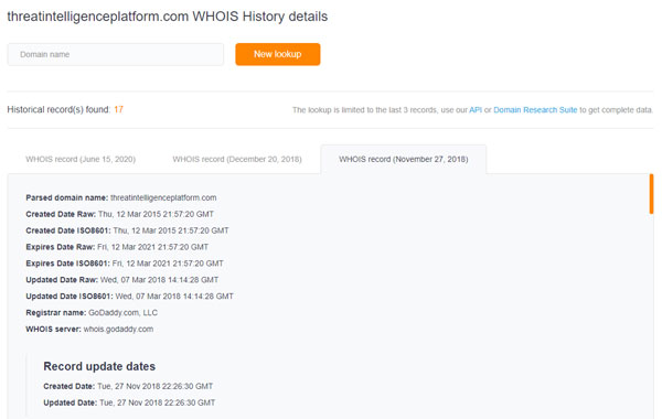 לדומיין יכולה להיות היסטוריה ארוכה, שחיפוש WHOIS פשוט לא יכול לגלות. בעזרת WHOIS History API וכן WHOIS History Lookup, המשתמשים יכולים לחשוף את פרטי הבעלות ב-WHOIS במשך יותר מ-10 שנים. ניתן גם להשתמש בכלי WHOIS History Search, שהוא חלק מחבילת Domain Research Suite.