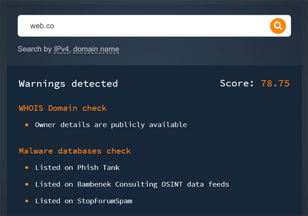 Domain Reputation שימושי כאשר המשתמשים מעוניינים להעריך את המוניטין של דומיין או של כתובת IP. ה-API אוסף נתונים ממקורות שונים של מודיעין בנוגע לדומיינים, כולל רשומות WHOIS, תצורות מארחים ופידים שונים של נתוני תוכנות זדוניות, ומסכם את הממצאים בתוספת ציון ואזהרות רלוונטיות עיקריות. לכלי זה יש גם גרסת חיפוש.