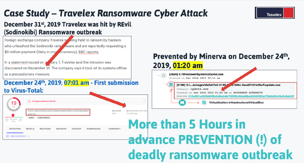 כפי שניתן לראות באיור מטה, הנוזקה זוהתה ככופרה זדונית והועלתה בראשונה למאגר מנועי האנטי וירוס ודגימות הקבצים VirusTotal ב-24 בדצמבר 2019 בשעה 07:01 בבוקר. מינרווה מנעה את אותה הנוזקה (כופרה) בדיוק אצל אחד מלקוחותיה יותר מחמש שעות לפני כן, בשעה 01:20 באותו היום.