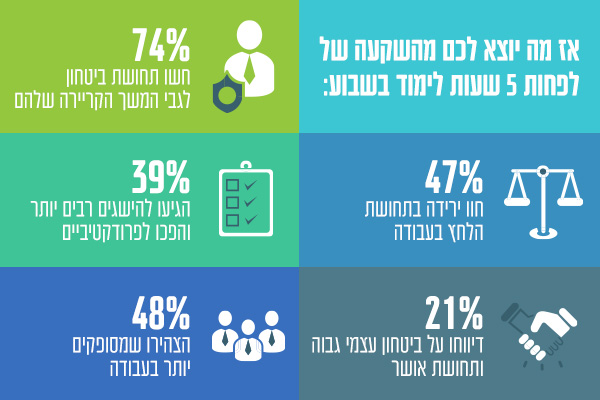 המחקר השווה בין עובדים שלומדים חמש שעות שבועיות לבין עובדים שמשקיעים בלמידה עד שעה אחת בשבוע וגילה כמה נקודות מעניינות ששווה לתת עליהן את הדעת. אלה שהקדישו יותר זמן ללמידה ידעו טוב יותר לאן הם רוצים לנתב את הקריירה שלהם, מצאו סיפוק גדול יותר בעבודה, היו פחות לחוצים ויותר פרודוקטיביים, הרגישו ביטחון עצמי גבוה יותר והיו מאושרים יותר בעבודה.
