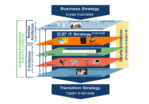 אסטרטגיית מערכות המידע משלימה את הארכיטקטורה העסקית על ידי הגדרת המידע הנדרש בתהליכי העבודה. זרימת המידע חייבת ללוות את התהליכים העסקיים ולספק להם את הנתונים והמידע הנדרש לביצוע יעיל ואפקטיבי. יחד עם זאת אנו רואים לעתים קרובות כי גם זרימת המידע ניתקת מהתהליכים בגלל התיישנותה או שינויי בתהליכים. לכן גם שלב זה חייב להיות מוגדר בהתאמה לתהליכים העסקיים הנדרשים. רק לאחר השלמת ההתאמה בין שתי השכבות הראשונות ניתן להגדיר מהם היישומים הנדרשים לארגון, מה התשתית הטכנולוגית התומכת ואופן הניהול והבקרה שלהם – כל אלה מהווים את ארכיטקטורת מערכות המידע שתתמוך בזרימת המידע המתאימה לצרכי הארגון.