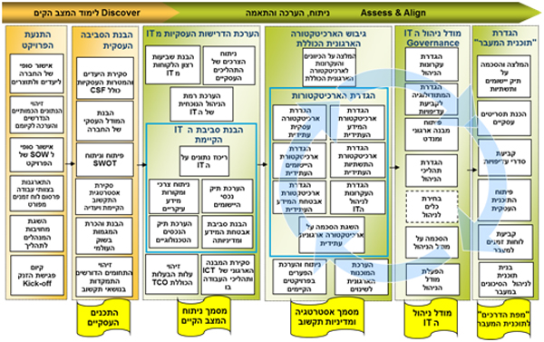 ● Discover – שלב הלימוד – כולל את הלימוד וההכרה של הסביבה העסקית הפנימית והחיצונית הקיימת והמגמות בשוק, הסביבה הטכנולוגית הקיימת והתחזיות לגביה, נושאים לטיפול בעדיפות בהתאם ללחצים הצפויים מתוך הארגון ומהרגולציה החיצונית, וזיהוי הזדמנויות לשינוי. שלב זה מאפשר לגבש את ההנחות לגבי דרישות ושינויים עסקיים צפויים, העדיפות שלהם והשלכתם על תוכניות העבודה.