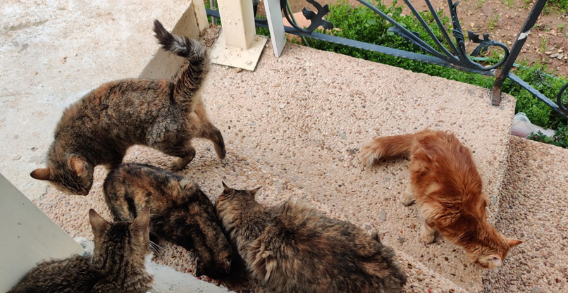 חתולי רחוב בבית ג'אן אוכלים מהאוכל שפראס שם להם. צילום: פרטי