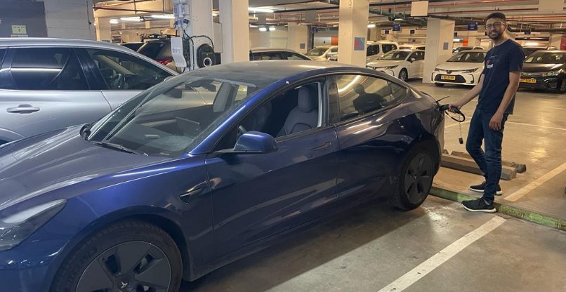 מוחמד מסארוה מגיע למשרד ומחבר את הטסלה למטען, אשר מנוהל באופן אופטימלי על ידי פלטפורמת הניהול של דרייבז. צילום: יח"צ