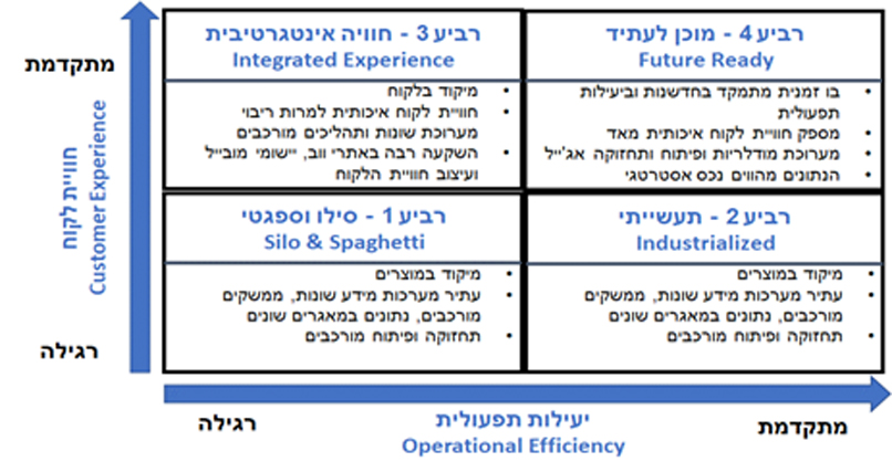 רביע 3 – חוויית לקוח אינטגרטיבית: ארגון שבמהלך השנים היה ממוקד בשיפור איכות חוויית הלקוח ופחות ביעילות התפעולית הפנימית. ארגון במצב זה, יש לו בדרך כלל אתר ווב איכותי ומעוצב היטב, מציע ללקוחות מגוון יישומי מובייל איכותיים, ומשקיע משאבים בפיתוח מסע וחוויית לקוח איכותיים. 20% מהארגונים בסקר היו במצב זה.