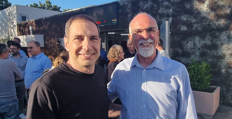 מימין: ארנון זוארץ, תא"ל (מיל'), לשעבר קצין קשר ותקשוב ראשי וראש מטה אגף התקשוב; ושלמה ענבר, אלוף (מיל'), שהיה מפקד יחידה 848 (כיום 8200), קצין קשר ואלקטרוניקה ראשי, וראש יחידת המחקר והפיתוח במשרד הביטחון. צילום: פלי הנמר