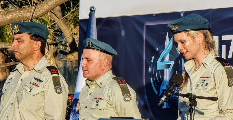 מימין: תא"ל עומר דגן מברך את מחליפתו, תא"ל יעל גרוסמן, ובמרכז האלוף ערן ניב, ראש אגף התקשוב וההגנה בסב"ר. צילום: פלי הנמר