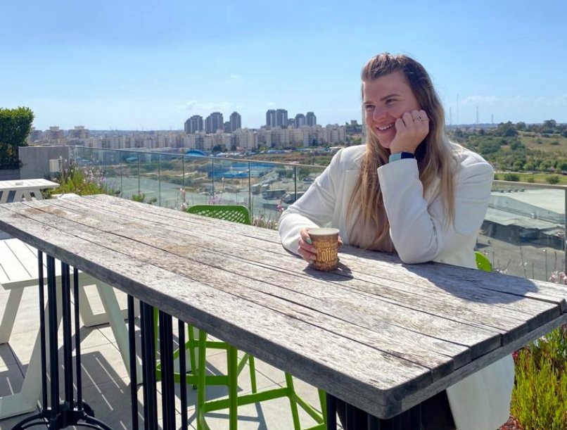 אצל הלקוח, בהפסקת קפה עם נוף. אנה טרבונקו, מנהלת פרויקטים ומפתחת BI בקליק ישראל. צילום: יח"צ