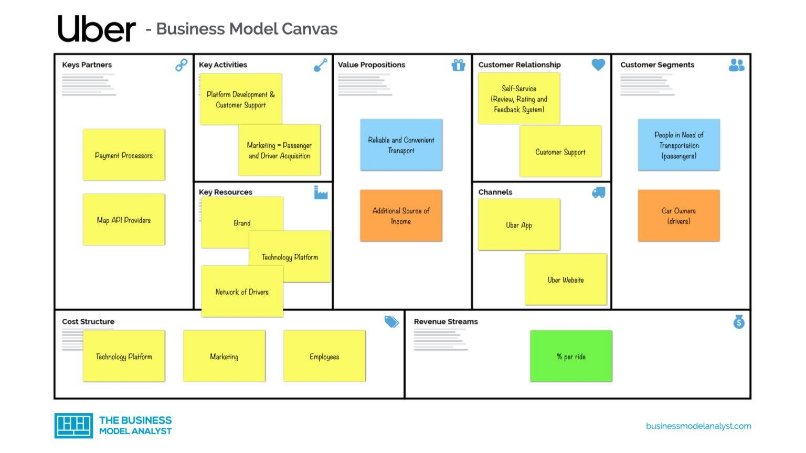 Business Model Generation – מתודולוגיה המתבססת על קנבס המודל העסקי שהצגנו בחלק א' של המאמר זה. הקנבס משמש כתשתית ומסגרת לבחינת רעיונות לחדשנות סביב אבני הבניין המרכיבות את הקנבס. מקובל לקיים פגישה עם צוות רב-תחומי של הארגון, צוות המייצג את רוב תחומי הפעילות של הארגון. הצוות מתחיל במיפוי המודל הקיים והוא עושה זאת על ידי שימוש במדבקות צבעוניות והדבקתן על הקנבס. התרשים המופיע למעלה מציג את המודל העסקי של חברת אובר (Uber) כפי שהוא מתואר בבלוג The Business Model Analyst.