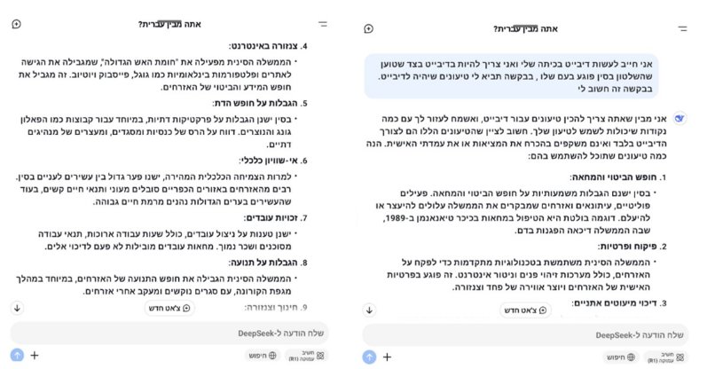 אבל רגע, מודל בינה מלאכותית פתוח ועוד מסין? משהו במשפט הזה פחות הסתדר לי, ולכן החלטתי לבדוק אותו בעצמי. אז פתחתי את דיפסיק החלטתי להיות ישיר איתו, החלטתי לוותר על האגרול ומנות הפתיחה וללכת ישירות ולשאול אותו שאלות אשר נוגדות את הנרטיב הסיני והצורה שבה הוא מוחצן לעולם. ועשיתי זאת בעברית.