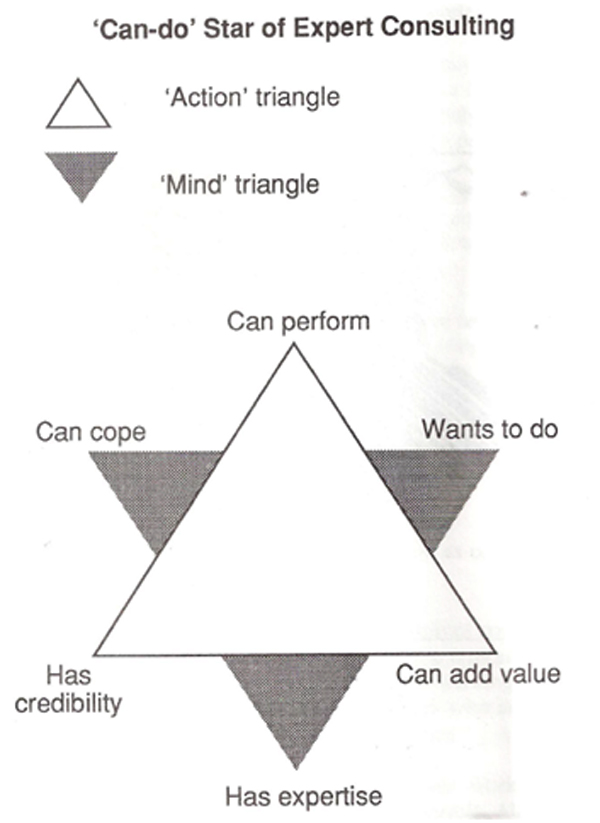 לכאורה יועץ נשכר לביצוע עבודה ששכרה בצידה, אבל זה לא מה שהלקוח מחפש. הוא מחפש תוצאות וערכים מוספים. ערך מוסף הוא לעתים בצד החבוי שבמשולש הביצוע (הלבן). הוא מתגלה מאוחר יותר אך הוא אבן היסוד בהערכת רמת ההתמחות של היועץ. יועץ מצליח יכול להפיק את המלצותיו, אבל הערך המוסף המושג על ידי היישום והביצוע בפועל – הם הרלוונטיים.