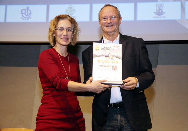 ראש עיריית רעננה, זאב בילסקי, מקבל אות הוקרה מליאורה שכטר, יו"רית פורום המנמ"רים ברשויות המקומיות. צילום: ניב קנטור