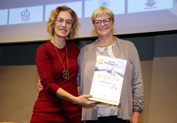 ענת ספקטור, המנמ"רית הפורשת של עיריית רעננה, מקבלת אות הוקרה מליאורה שכטר, יו"רית פורום המנמ"רים ברשויות המקומיות. צילום: ניב קנטור