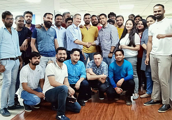 אמיר זלצר (לוחץ יד) והצוות של מרכז הפיתוח של TeamScale בהודו. צילום: יח"צ