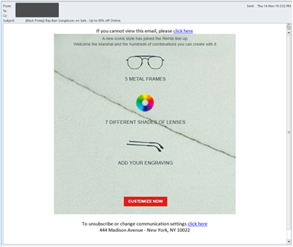 כך, יותר מ-1,700 דומיינים דומים למראה לכתובת האתר של אמזון amazon.com נרשמו במהלך ששת החודשים האחרונים, כגון "amaz0n-jp [.] Com" שמתחזה לאתר אמזון יפני. השימוש הזדוני הראשון הוא ככתובות דוא"ל. שחקני האיום ישתמשו בדומיינים אלה וישלחו מיילים המציעים מבצעי מכירות מיוחדים. לדוגמה, הדוא"ל הבא, שנחסם על ידי המערכות של צ"ק פוינט השבוע, הציע הנחה מיוחדת לבלק פרידיי של עד 80% הנחה על משקפי שמש של ריי באן.