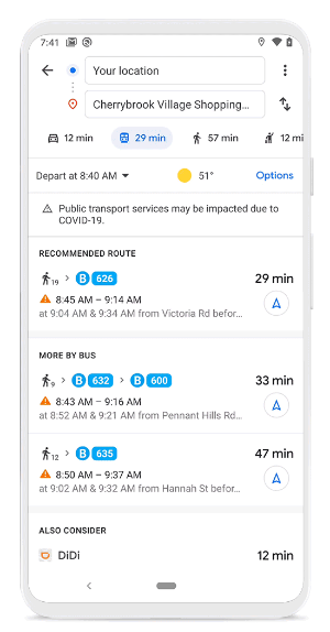 לדוגמה, משתמש יוכל לראות אם ההנחיות במקום כוללות שירותי תחבורה מושבתים או שונים מבשגרה, וכן אם הוא מחויב לעטות מסיכת פנים בעת שימוש בשירותי התחבורה הללו. התראות התחבורה הציבורית שגוגל תוסיף בהתאמה לאזור יפעלו בארגנטינה, אוסטרליה, בלגיה, ברזיל, קולומביה, צרפת, הודו, מקסיקו, הולנד, ספרד, תאילנד, בריטניה, וכמובן בארה"ב.