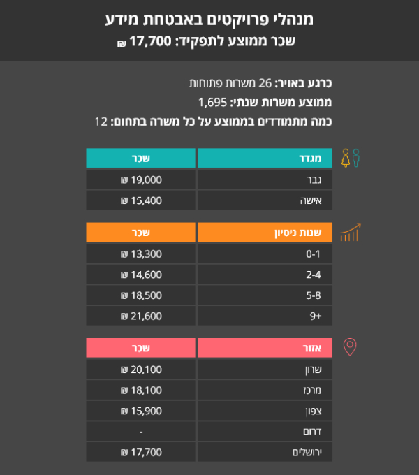 אז כמה משתכרים בתחומים אחרים בהיי-טק? אתם מוזמנים להיכנס לכתבות הקודמות במדור, שבהן בדקנו מהו השכר של המשכורות בתחום התוכנה, מנמ"רים ואנשי IT, אנשי חומרה, אנשי אינטרנט ודיגיטל, אנשי QA ואנשי מחשבים ורשתות.