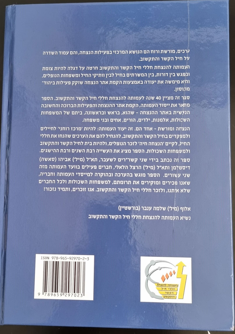 בתמונה למעלה: מימין – סא"ל (מיל') יהודה מתיתיהו, מנכ"ל העמותה להנצחת חללי חיל הקשר והתקשוב; ציפי רוזן, העורכת הלשונית של הספר ורעייתו של אל"מ (מיל') דני רוזן, יו"ר ועדת המורשת של העמותה; מרדכי אלגרבלי, חבר הוועד המנהל ויו"ר ועדת הכספים של העמותה; תא"ל יוסי כראדי, הקשר"ר הנוכחי; יעלה מקליס, ראשת עיריית יהוד-מונוסון; האלוף ערן ניב, ראש אגף התקשוב וההגנה בסייבר; תא"ל (מיל') מוטי בר דגן, יו"ר העמותה ויו"ר צוות, ובעבר הקשר"ר; תא"ל (מיל') הרצל הלאלי, חבר הוועד המנהל של העמותה ומכותבי הספר, ובעבר הקשר"ר; אלוף (מיל') שלמה ענבר, נשיא העמותה; ותא"ל (מיל') אביהו דיסטלמן, חבר הוועד המנהל של העמותה, מכותבי הספר ובעבר הקשר"ר.