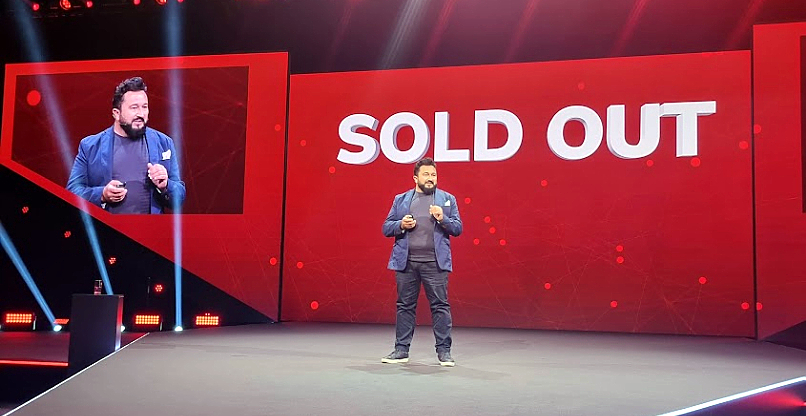 על הבמה: מנכ"ל IFA, אוליבר מרלין, המציג את ההוכחה להצלחת התערוכה השנה, והיותה שיא חדש בממדיה – במושג המוכר המורכב מצמד המילים: Sold out. כן, כל 40 אולמות התערוכה לפי מספרם (למעשה יש יותר, כי לחלק מאולמות הממוספרים יש גם אולמות סמוכים A, B, לעיתים גם C). צילום: פלי הנמר
