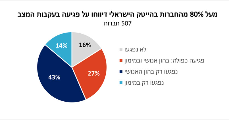 המלחמה פוגעת משמעותית בהיי-טק הישראלי: יותר מ-80% מהחברות בענף נפגעו ממנה – כך עולה מסקר של רשות החדשנות ו-SNPI, שפורסם היום (ב'). בסקר נבדקה הפגיעה בחברות בהיבטים של הקושי בהשגת מימון (ביטול או עיכוב הסכמי השקעות, והקושי להגיע למשקיעים) וכוח האדם, עקב הגיוס הנרחב למילואים. יותר מרבע מהחברות דיווחו שהן נפגעו מאז תחילת המלחמה בשני ההיבטים הללו, 43% נפגעו עקב גיוס עובדים למילואים ו-14% – בהיבט המימון. רק 16% מחברות ההיי-טק ציינו כי הן לא נפגעו כלל מהמצב.