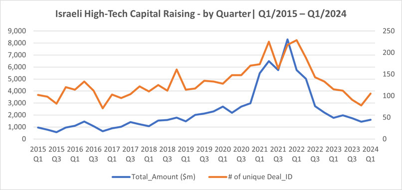 ההיי-טק הישראלי מתחיל להתאושש מהמשבר של 2022 ו-2023, ופותח את 2024 ברגל ימין: על פי נתוני IVC ולאומי טק, חברות הסטארט-אפ הישראליות רשמו ברבעון הראשון של השנה עלייה של 10% בגיוסים לעומת הרבעון הקודם – ל-1.6 מיליארד דולר. כמו כן, נרשמו במהלכו עליות במספר העסקאות בכלל ובמספר הסבבים המוקדמים בפרט.