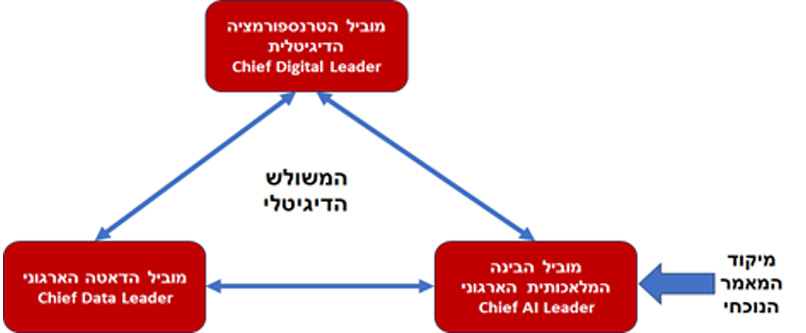 ההאצה בשילוב טכנולוגיות ה-AI בארגון והחשיבות ההולכת וגדלה שלהן, הביאה לצורך בתפקיד חדש, מוביל ה-AI. מוביל זה מהווה קודקוד חשוב בתוך הארכיטקטורה הארגונית החדשה, ארכיטקטורה לה קראתי המשולש הדיגיטלי. בניית צוות ושיתוף פעולה בין שלושת הקודקודים, תוך בהירות של תחומי האחריות של כל אחד מהם, היא קריטית להצלחת הארגון בעידן הדיגיטלי.