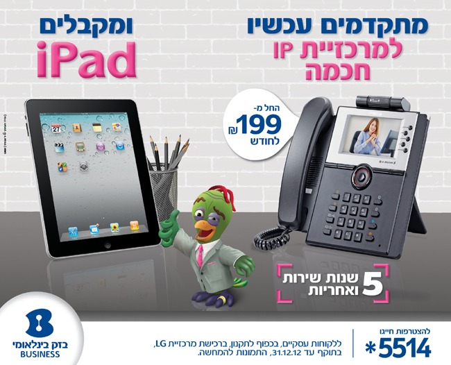 בזק בינלאומי, חברת פתרונות התקשורת וה-IT האיכותיים והמתקדמים לעסקים, מכריזה על מבצע חדש כחלק מאסטרטגיית החברה לספק ללקוחותיה פתרונות תקשורת כוללים. במסגרת המבצע מציעה בזק בינלאומי לעסקים את ההטבה הבאה: רוכשים מרכזיית IP חכמה של המותג Ericsson-LG ומקבלים Ipad.
