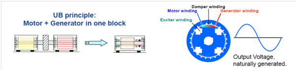 יחידות הייצור מורכבות מיחידת Uniblock סובבת (Motor Generator) שמספקת מתח מיוצב ומסונן לצרכן. ה-Uniblock שסובב במהירות קבועה של 1500 סל"ד – ממשיך, בעת הפסקת חשמל, לספק אנרגיה חשמלית רציפה מגלגל התנופה Flywheel Power Bridge שאינו מחובר מכנית על ציר המנוע.