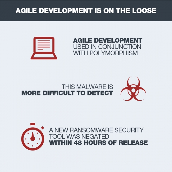 יצרני נוזקות הסתמכו תקופה ארוכה על פולימורפיזם (רב-צורתיות) כדי לחמוק מאיתור. הדו"ח מעלה כי הם פונים כעת לשיטות של פיתוח גמיש, כדי להפוך את הנוזקות לקשות אף יותר לאיתור וכדי למנוע את הצלחת מוצרי האבטחה נגדן. נוזקת GandCrab "זכתה" לגרסאות רבות השנה ומפתחיה ממשיכים לעדכן אותה בקצב מהיר.