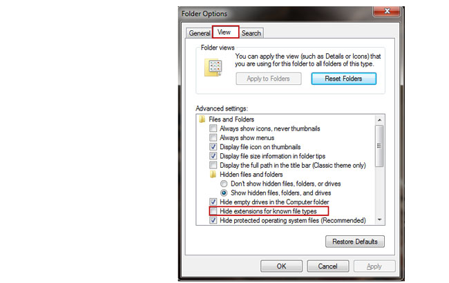 1.2. לעבור ללשונית תצוגה (View)-> ביטול ה-V מ "הסתר סיומות לקבצים מוכרים" (Hide extensions for now file types), לחיצה על אישור.