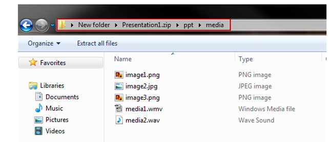 6. לחיצה פעמים על המצגת-> כניסה לתיקייה PPT-> ואז ל-Media.