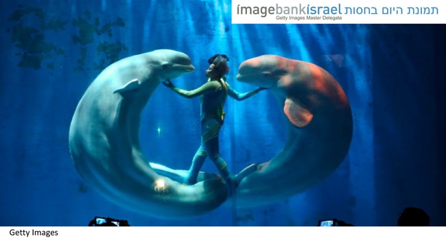 שני לווייתנים והמאמנת שלהם מופיעים בפני קהל באקווריום של חרבין, סין. מדובר באחד מאתרי התיירות הפופולריים של העיר, והוא מושך אליו בכל שנה מבקרים רבים – מסין ומחוצה לה.