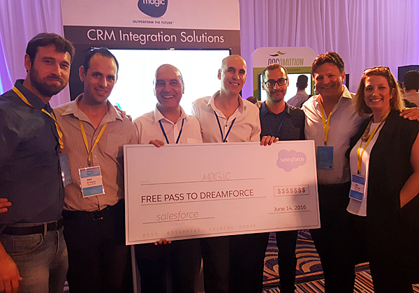 בתמונה: צוות מג'יק מקבל את פרס Salesforce. מימין: יפעת עומר, מנהלת מכירות במג'יק ישראל; יובל לביא, סמנכ"ל שירותים מקצועיים ותמיכה במג'יק; דן שפיר, מנהל השיווק של מג'יק ישראל; אריק מיפנו, מנהל מג'יק ישראל; משה נרדיה, מנהל מכירות במג'יק ישראל; אלי שלום, מנהל מכירות במג'יק ישראל; וגיל ויצמן, מנהל דיגיטל במג'יק
