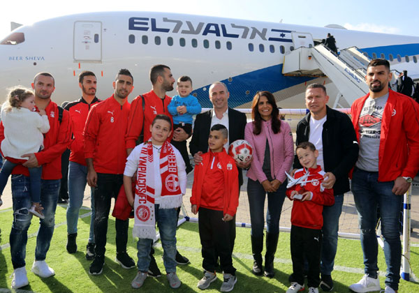 בתמונה: גונן אוסישקין מנכ"ל אל על; אלונה ברקת, הבעלים של הפועל באר שבע; ברק בכר, מאמן הקבוצה; השחקנים אריאל הרוש, לואי טאהא, מרואן קבהא, חאתם עבד אלחמיד ובן שהר; והילדים מבאר שבע. צילום: סיון פרג'