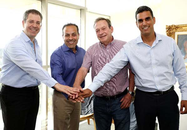 מימין: שי נוני, מנהל הסניף הישראלי ואזור אפריקה, קומוולט ישראל; יהודה זיסאפל, נשיא קבוצת רד-בינת; סאנג'יי מירצ'אנדני, מנכ"ל קומוולט העולמית; ושמעון אמויאל, מנכ"ל אבנט תקשורת. צילום: ניב קנטור