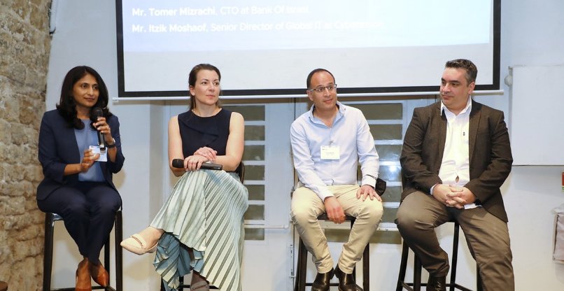 משמאל לימין: פורנימה פאדמאנאבהאן, סגנית נשיא VMware ומנכ"לית פתרונות ניהול הענן של החברה; אווה מריה המפה, דירקטורית בכירה לתחום Enterprise & SPP לאזור CEMEA בחברת VMware; תומר מזרחי, CTO בבנק ישראל; איציק מושאוף, Senior Director of Global IT, ב-Cybereason.
