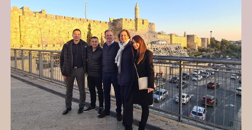 אנשי טכום ופנופטו על רקע מגדל דוד וחומות העיר העתיקה בירושלים. מימין לשמאל: דניס סטסקוויץ', מנהל מכירות, פנופטו; אלכס ריבל, מנהל מכירות, טכום; אביב ברוסילובסקי, מנכ"ל טכום; מיירה דה האן, מנהלת שותפויות ב-HIHAHO; ואפרת אליצור, מנהלת שיווק, טכום. צילום: פרטי