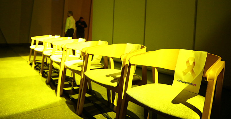 לא שוכחים את החטופים. הכסאות הצהובים הריקים באירוע הקיק-אוף של קבוצת אמן.