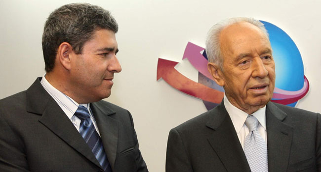 הנשיא שמעון פרס לצידו של מוטי גוטמן בסיור באתר תלפיות במודיעין עילית