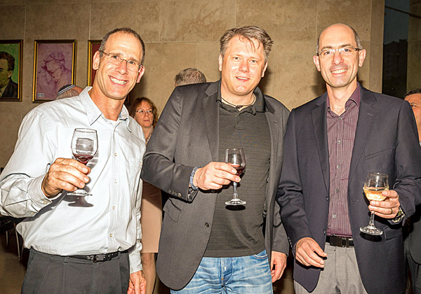מימין: ראול בונה, יו"ר תזמורת פיליפס מדיקל; איתן אופנהיים, מנכ"ל נובה מכשירי מדידה; וג'יל בשור-פלאג, שגריר הולנד בישראל. צילום: עידן עופר