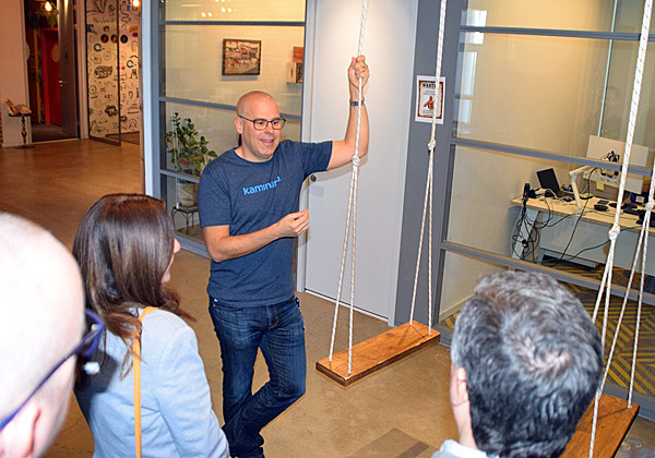 גולן מסביר לחברי המועדון על הקונספט העיצובי של משרדי קמינריו: כיוון שהחברה עוסקת בזכרונות פלאש, כל קומה עוצבה באלמנטים הקשורים לזיכרון. קומה ג' מעוצבת עם אלמנטים הקשורים לזכרונות ילדות – נדנדה, שרטוט של משחק קלאס על הרצפה, כרזות של בזוקה ג'ו וחדרים שקרויים על שם דמויות מהילדות. התמונה מצולמת ליד חדר הישיבות קשקשתא. צילום: אורן בסון